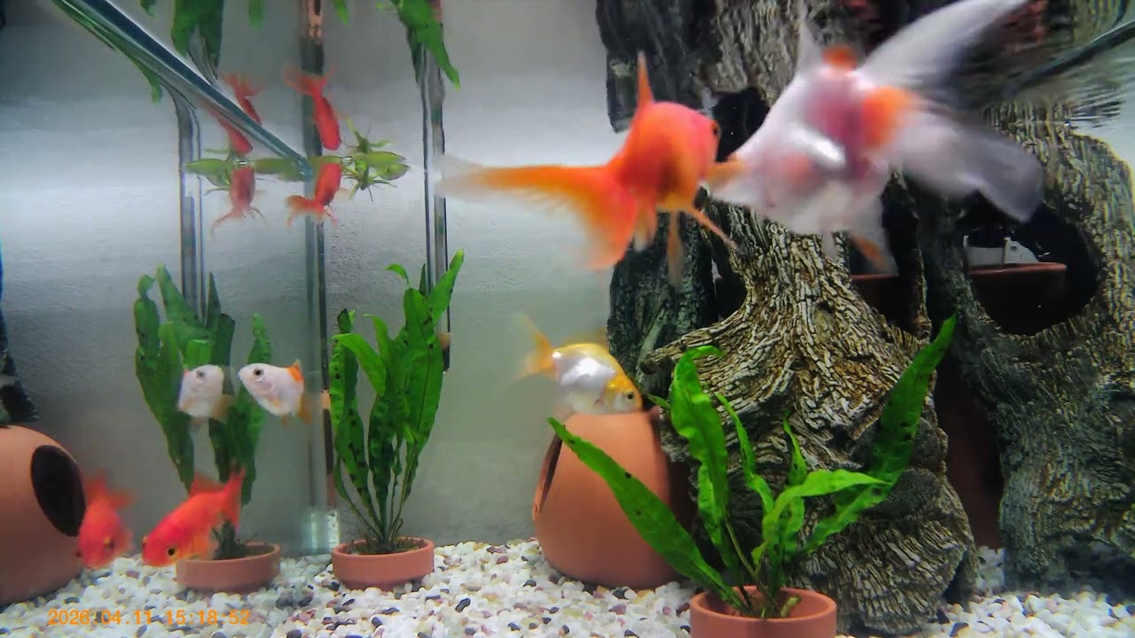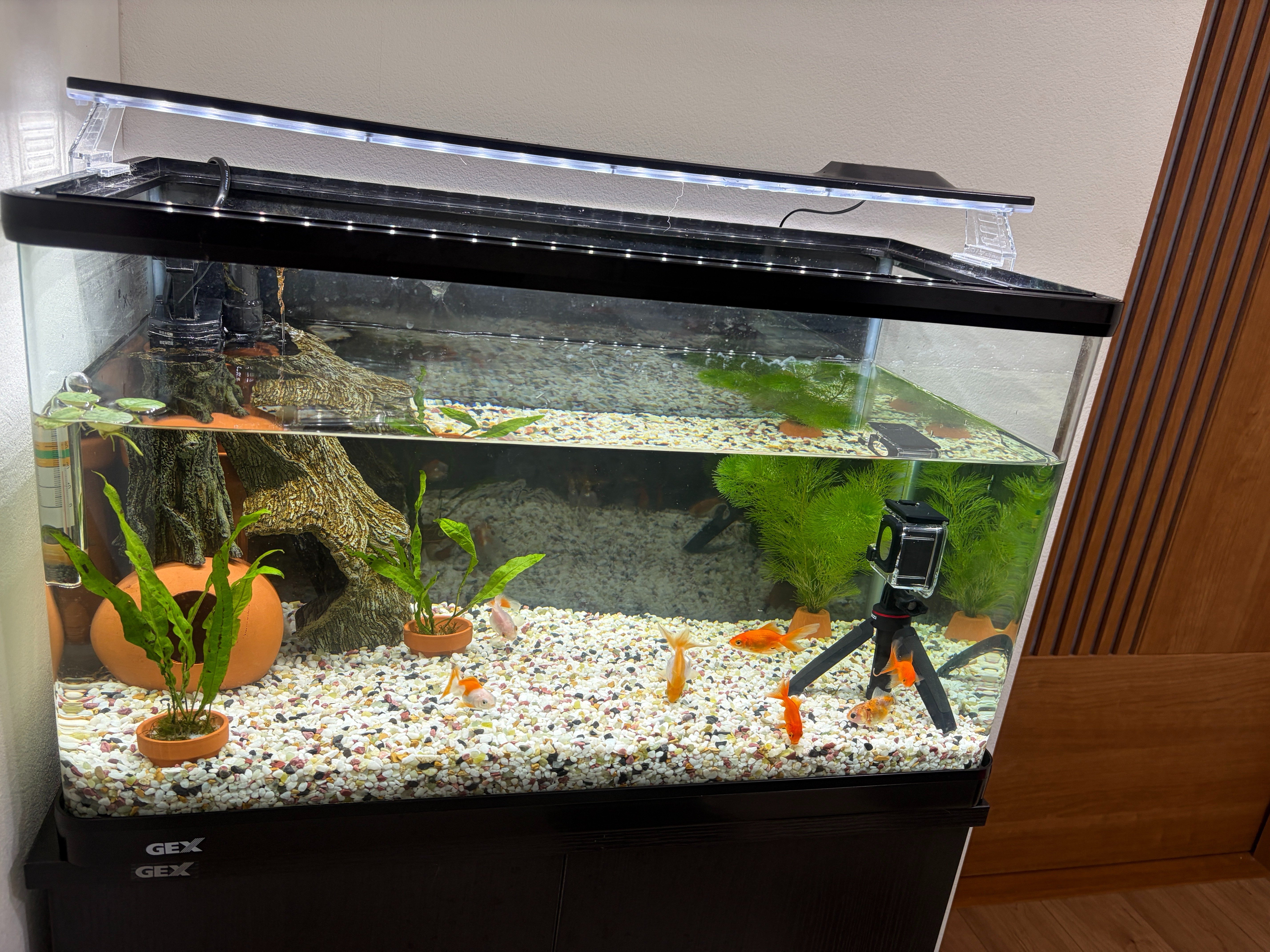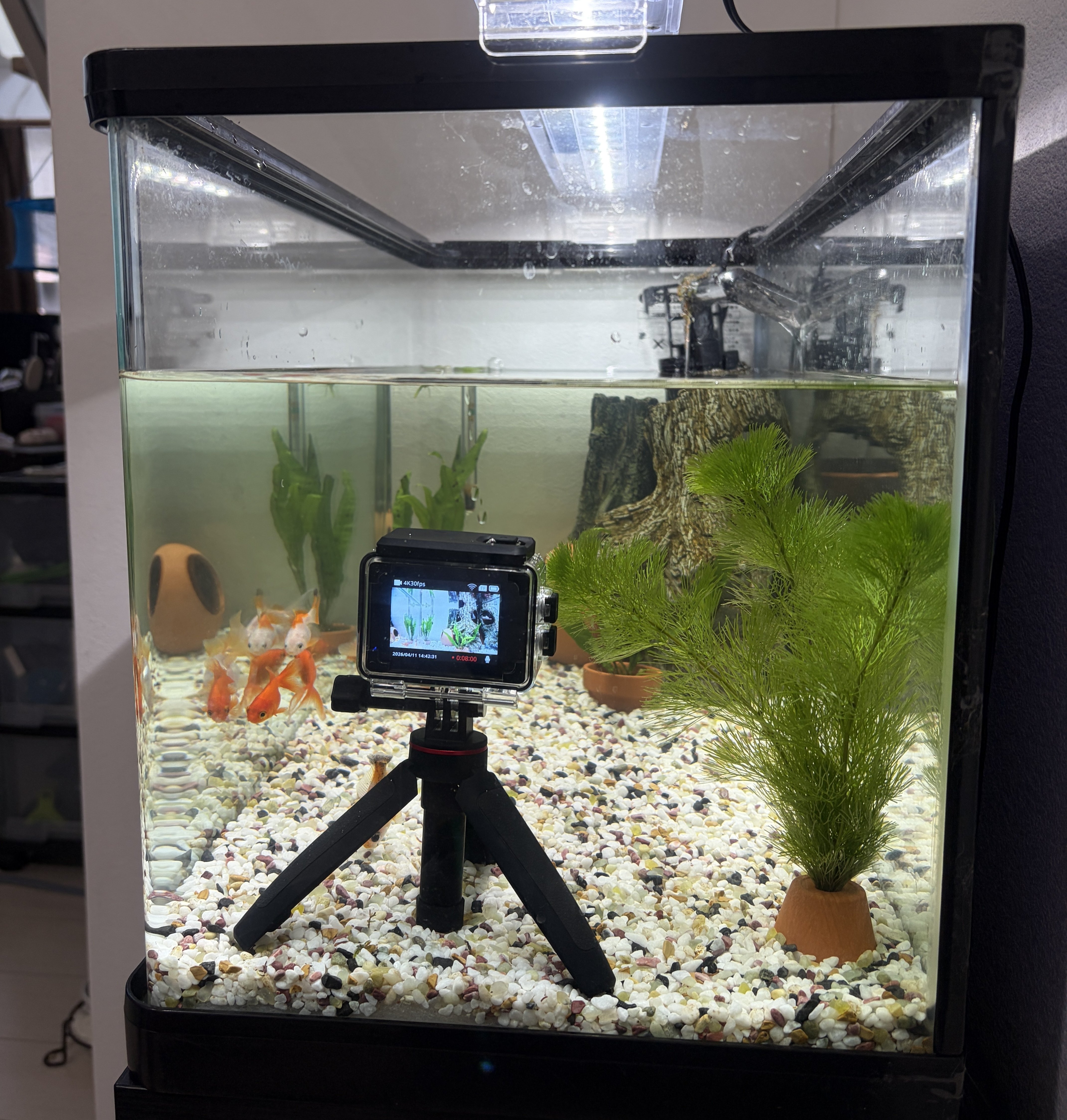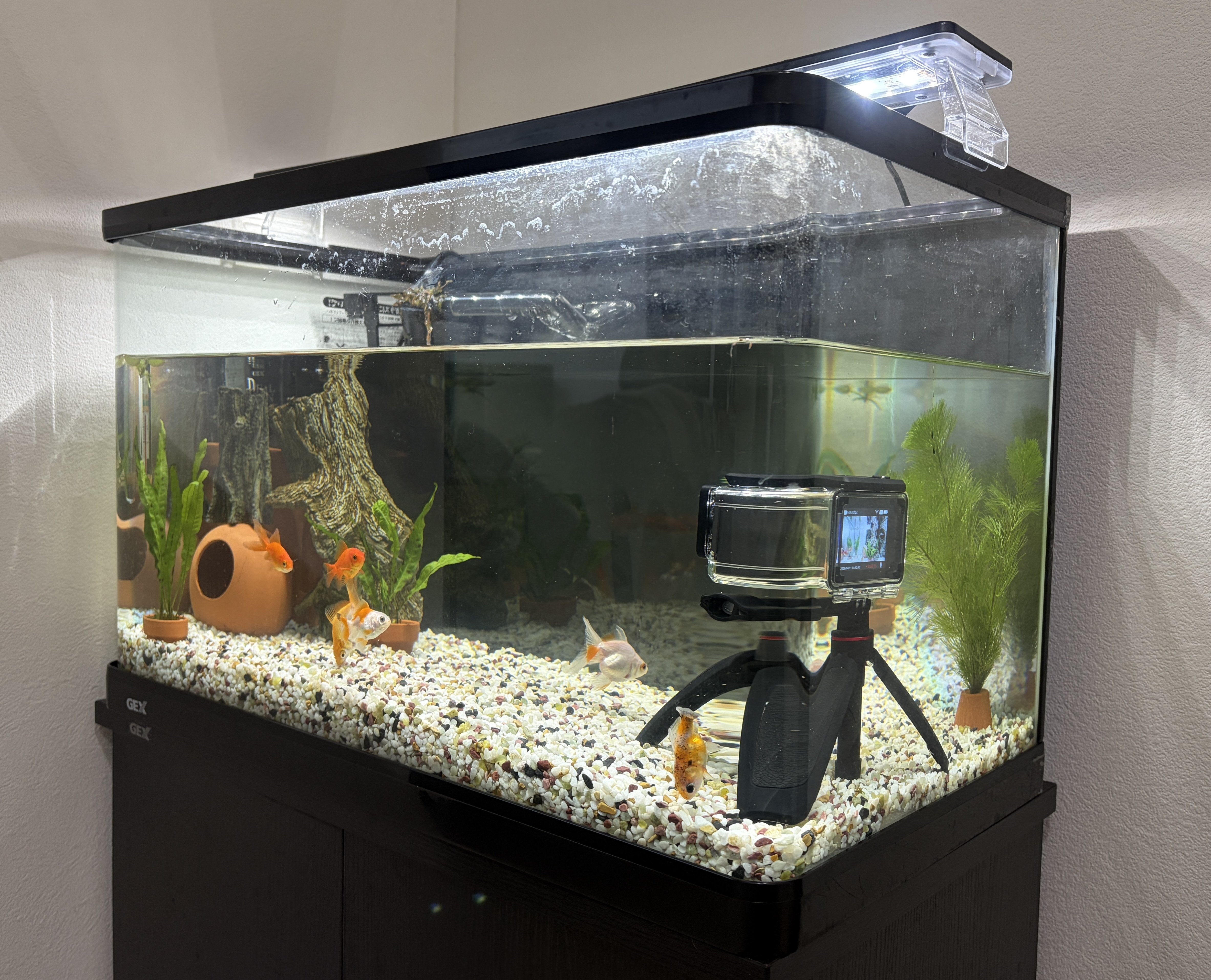 水槽の中に三脚でセットして撮影。170度の広角レンズのおかげで、水槽全体をしっかり収めることができました。