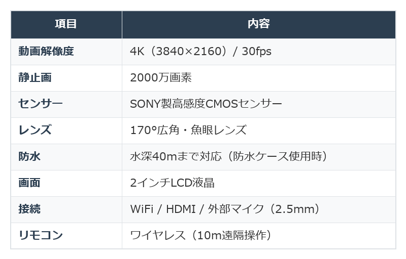バッテリー持続時間や設定リセットといった細かい不満はあるものの、この価格でSONYセンサー・4K・外部マイク・防水ケース完備というのはコスパが高いと感じます。説明書も日本語で丁寧に書かれており、初心者でも迷わず使い始められました。
